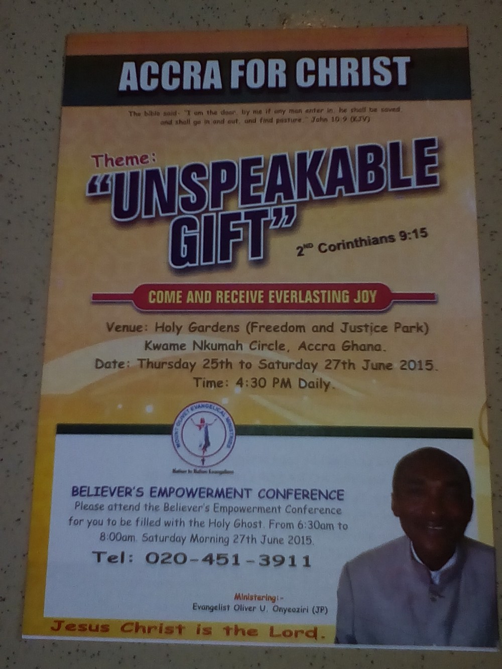 We had our last . annual crusade = Accra For Christ 2015 and the Believer’s Empowerment Conference = 25th To 27th June 2015. And Souls were Won for Christ and a Mad Man was healed and delivered from the bondage of the devil and he gave his life to Christ. Glory be to God. Amen.