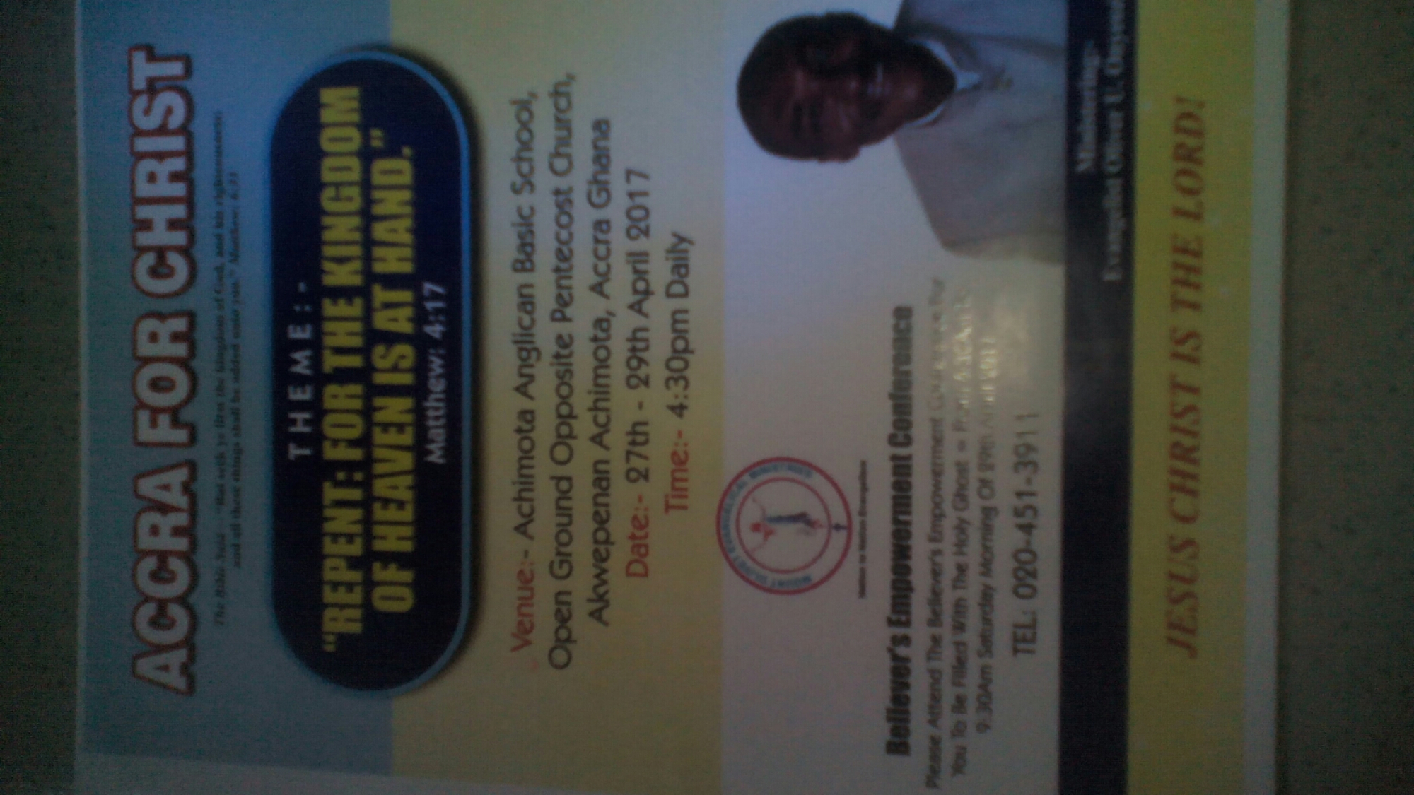 Please any Minister of God that is interested to minister in the crusade Accra For Christ 2017– Should write to the Evangelist via email = molevministries@gmail.com . Please the Interested Minister of God will finance his/her trip and stay in Ghana for the crusade.