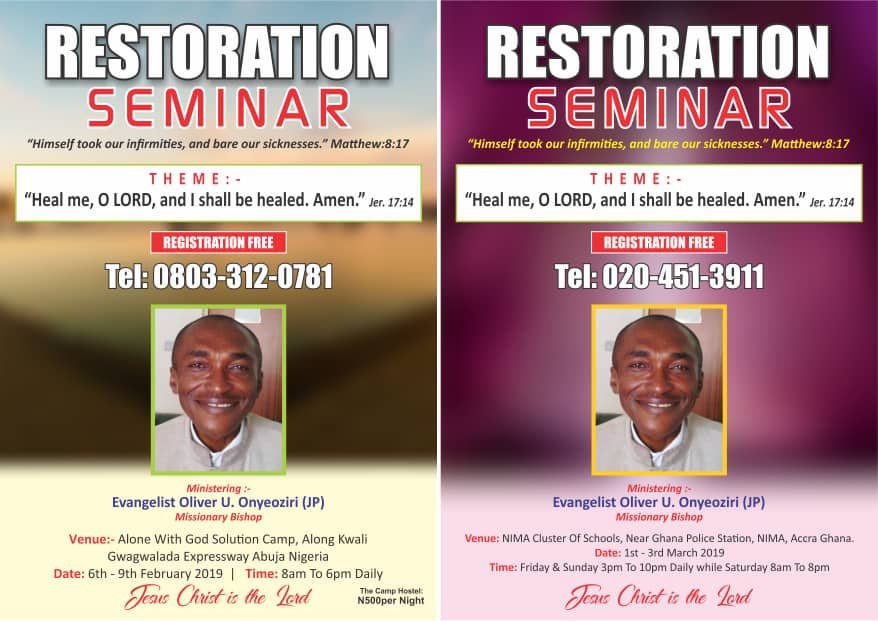 RESTORATION SEMINAR FOR TERMINAL DISEASE AND SICKNESS IN ABUJA NIGERIA AND ACCRA GHANA= {Abuja Nigeria:- (N1,970,000= USD $5442=)= Accra Ghana:- (Ghc32,500= USD $6633)}=