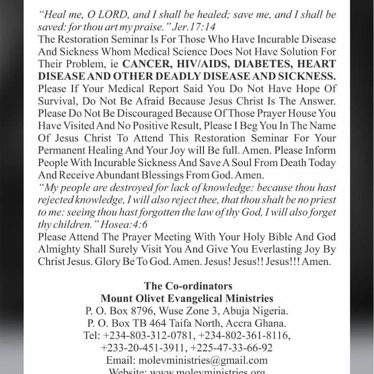 Beloved in Christ please we need money for the prayer meeting in Abuja Nigeria and Accra Ghana. Please the Restoration Seminar is free for those with incurable disease and sickness because the permanent healing from Jesus Christ is free but those who sponsor the prayer meeting shall be rewarded by God and the Son Jesus Christ accordingly. Amen.